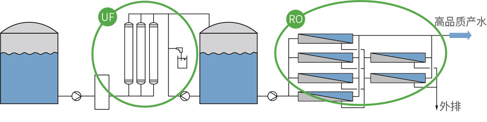 “超濾膜+反滲透膜”是目前以反滲透膜為核心工藝最常用的水處理工藝流程,超濾(UF)是以壓力為驅動(dòng)的膜分離過(guò)程,它能夠將顆粒物質(zhì)從流體及溶解組份中分離出來(lái)。超濾膜的典型孔徑在0.01-0.1μm之間,對于細菌和大多數病菌、膠體、淤泥等具有極高的去除率,作為反滲透的預處理系統,處理效果穩定,對污染物去除率高,對反滲透系統起到很好的保護作用。反滲透系統則利用其良好的脫鹽性能,去除水中的各種溶解性離子,產(chǎn)水達到回用標準。