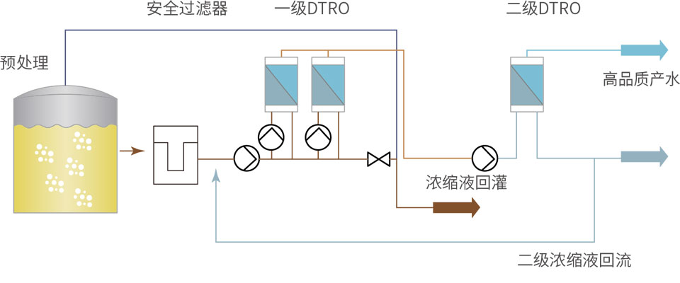 碟管式反滲透技術(shù)是目前國內能保證滲濾液出水穩定、持續達到《生活垃圾填埋場(chǎng)污染控制標準》(GB16889-2008)表2的標準的成熟技術(shù)。DTRO系統操作方式靈活,可根據滲濾液要求的排放標準選擇一級、二級處理形式,處理后的凈水可確保達到排放標準或回用水標準。系統經(jīng)濟的凈產(chǎn)水率為75%-80%,也可根據客戶(hù)要求配備高壓系統,達到90%-95%的產(chǎn)水率。